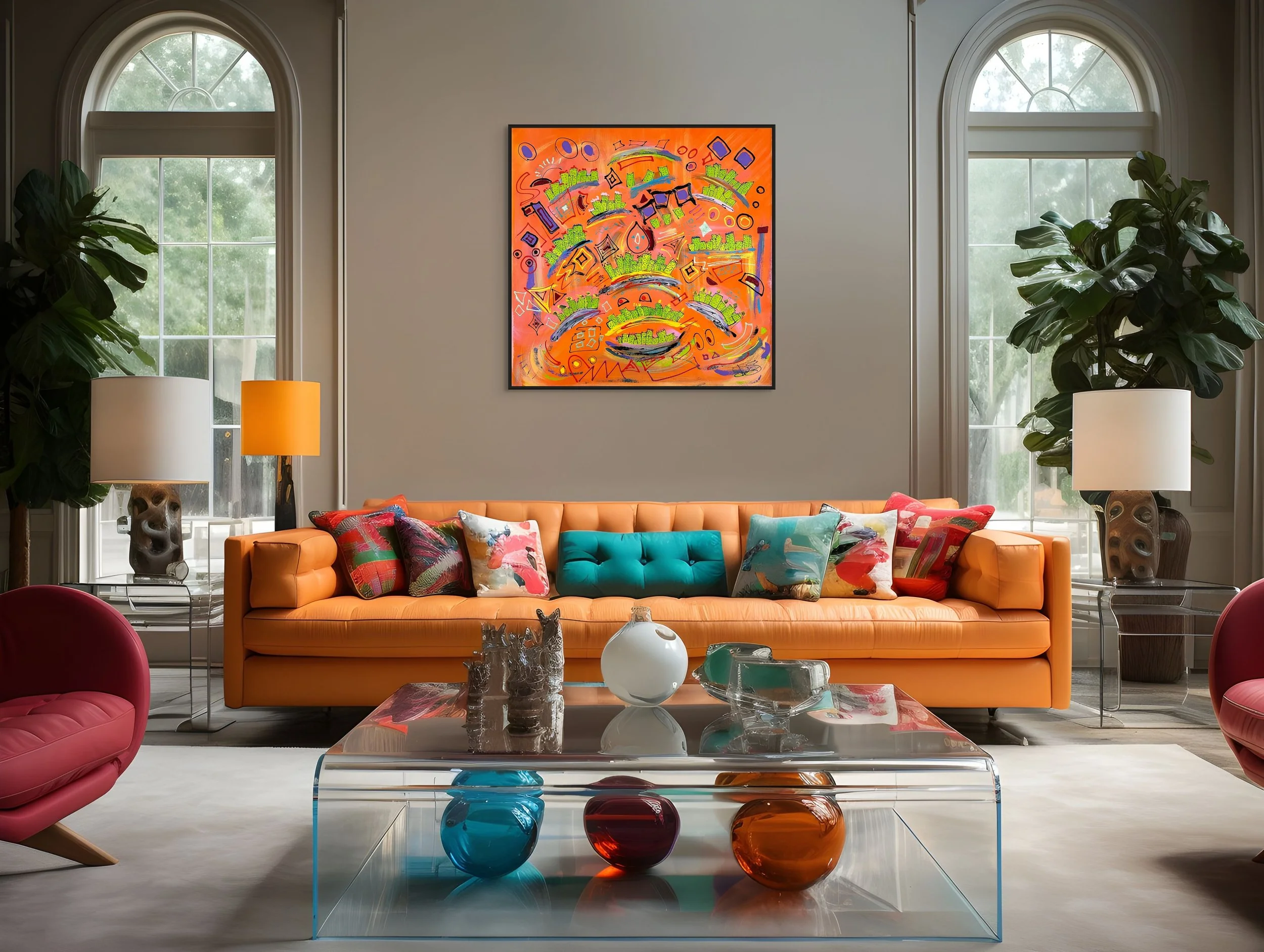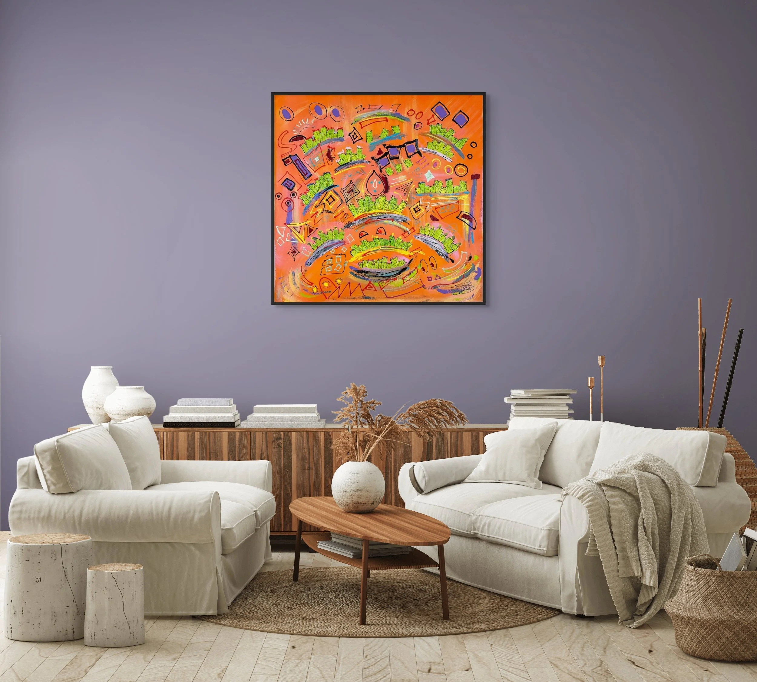 This painting brings an energetic and thought-provoking perspective into any space, enhancing the environment with a sense of modern vitality and colorful complexity.